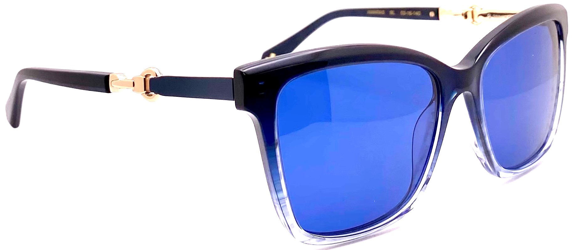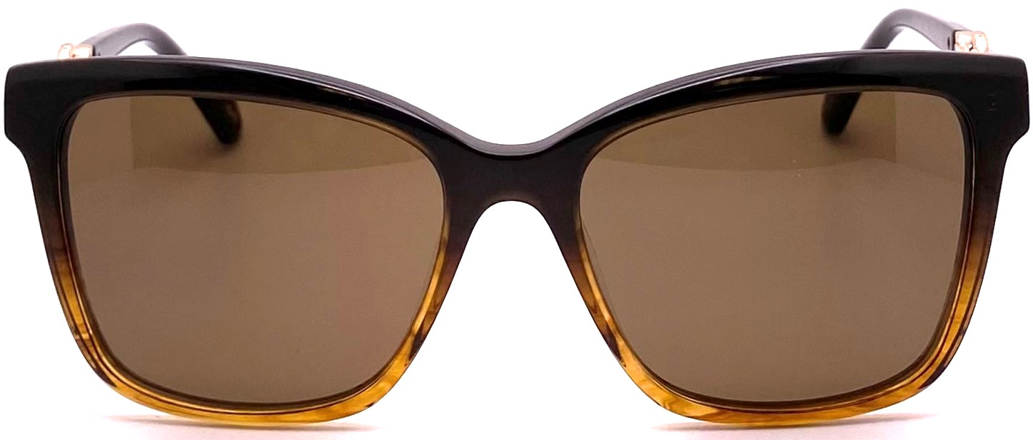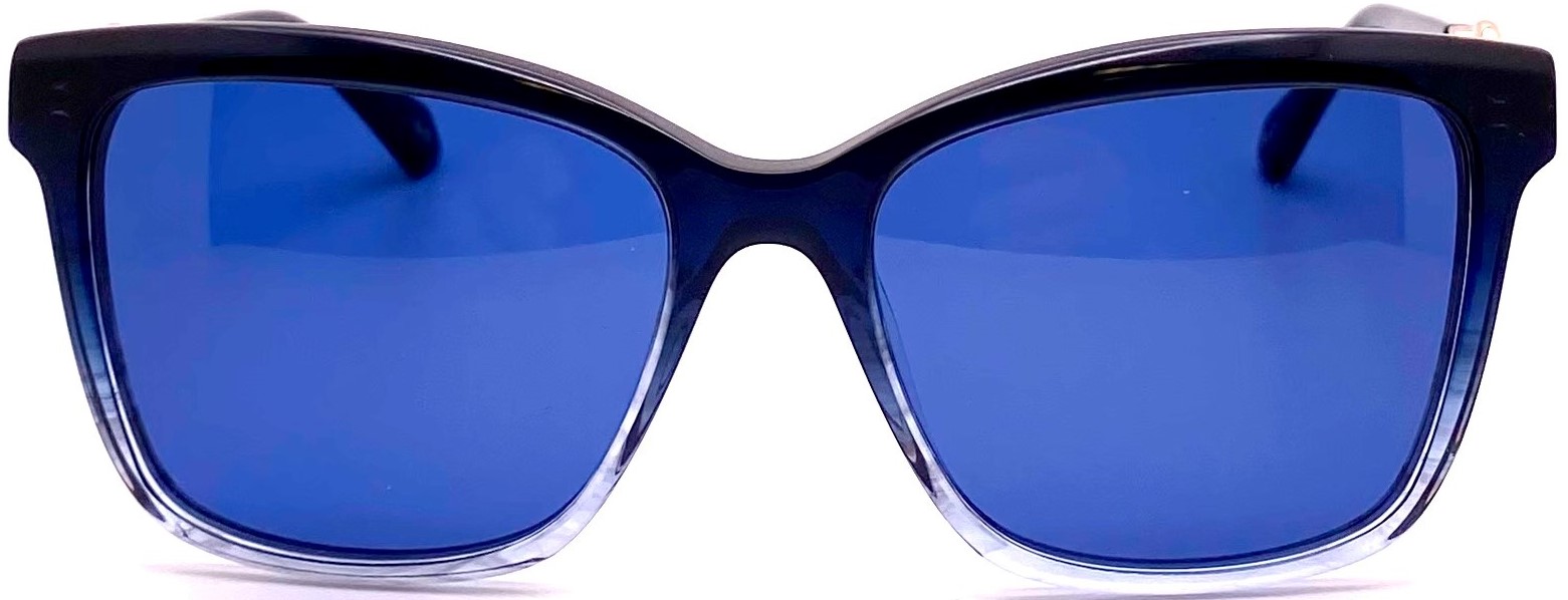 Custom bold Italian acetate colors fade to translucence from brow to cheek providing strength to subtlety