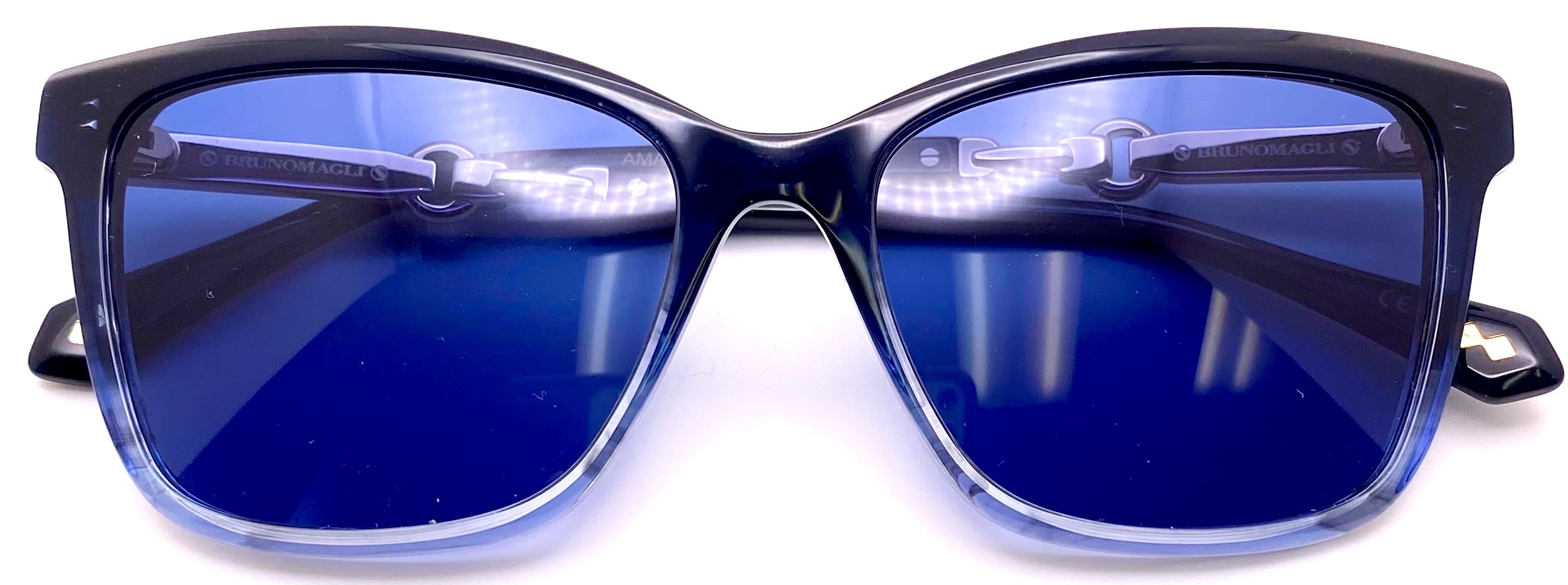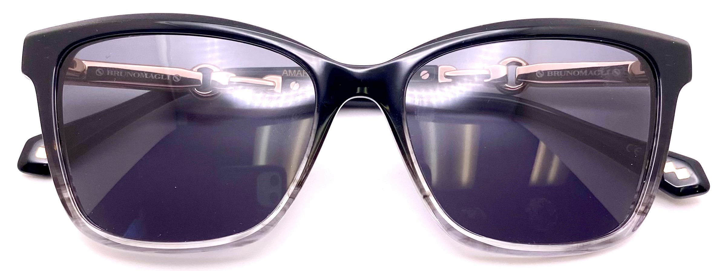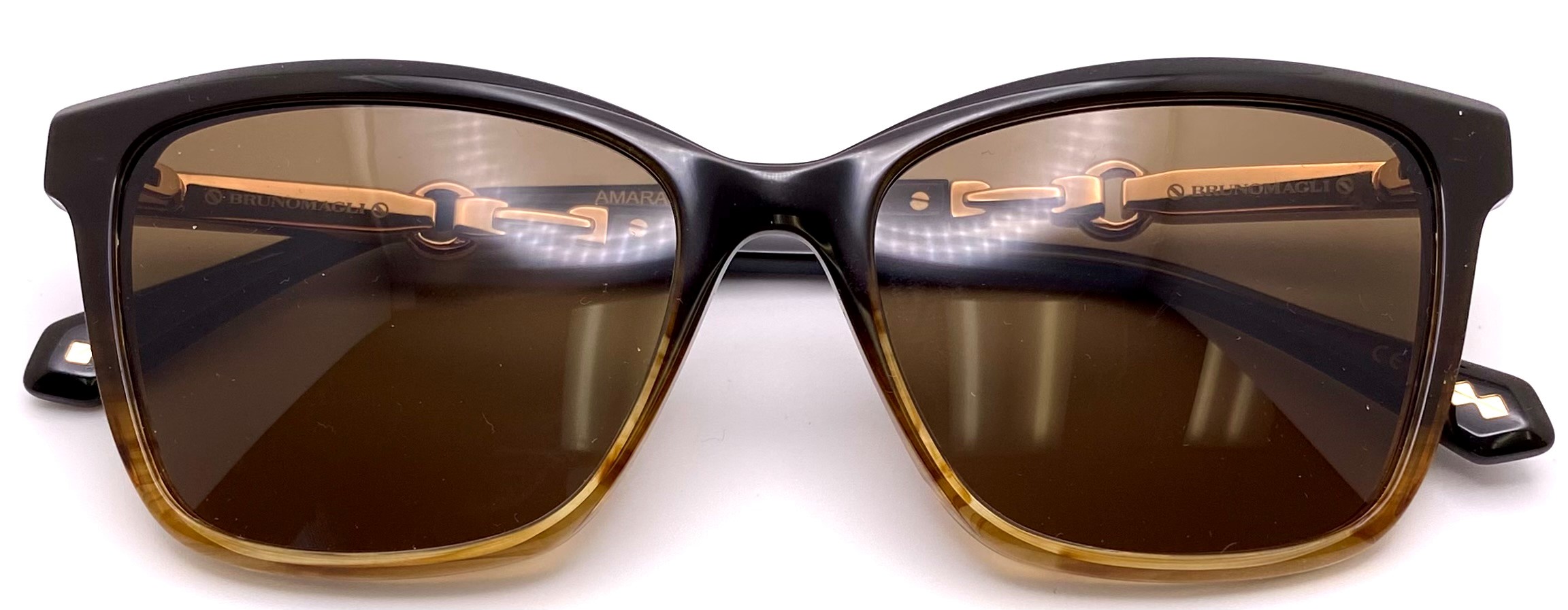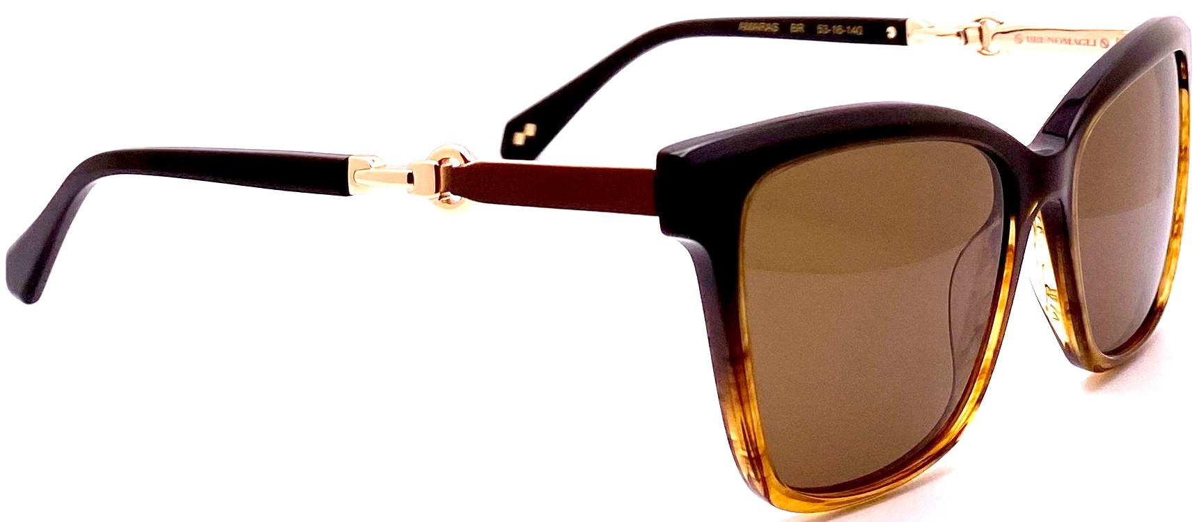 Temples are enhanced with the detailed gold metal buckle reminiscent of Bruno Magli's leather handbag couture